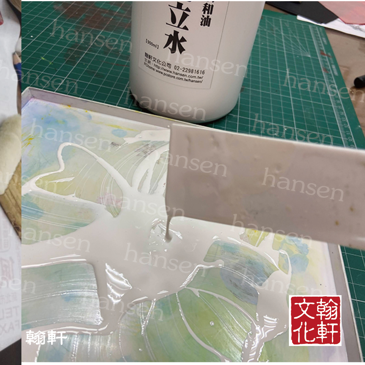 若使用噴漆方式,請在塗好粉蠟筆刻線後直接泡水,浸泡約4分鐘,再用面紙吸取水珠(水漬)後,